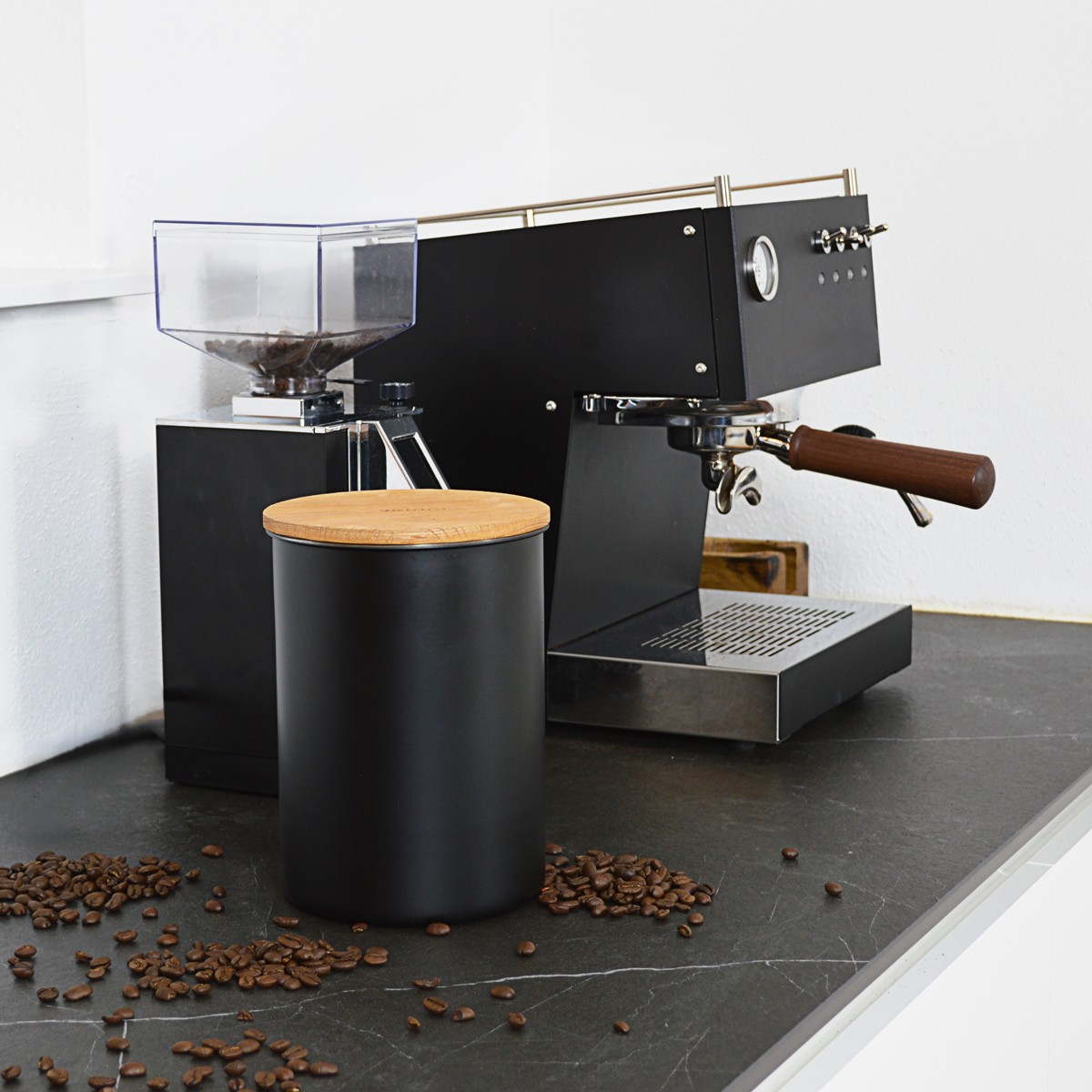 Die matte Oberfläche wirkt edel, das Material ist robust und sauber verarbeitet. Bietet ausreichend Platz für 1 kg Bohnen.